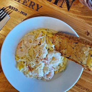 Made in-house pasta, Oregon Rockfish, prawns, and Manila clams. All tossed together with our own creamy Alfredo sauce and a slice of toasted garlic bread.