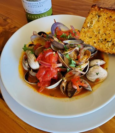 1lb of Manila clams, garlic butter, with wine, red onions, plum tomato, chili flakes, parsley. and a slice of toasted garlic bread.