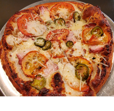 Alfredo sauce, fresh mozzarella cheese, Canadian bacon, chipped tomato, pickled jalapenos, & Greek oregano.